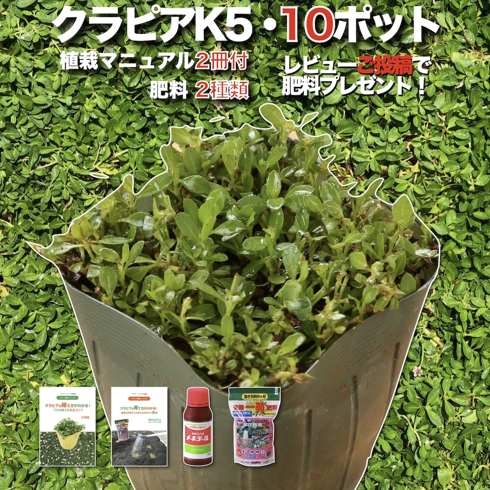 【レビュー特典あり】 クラピア K5 10株 すくすくセット 完全植栽マニュアル付き 苗10ポット 肥料2種(有機一発肥料、メネデール) 雑草対策 グランドカバー 送料無料 価格:7,980円 |